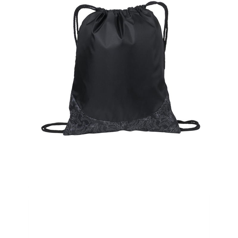 Colorblocking and vibrant prints give our budget-friendly cinch pack instant appeal for events and promotions. Fully patterned on the back and bottom front with a large unprinted decoration area on the front. All areas fully decoratable. | 210 denier polyester Black drawcord closure allows this bag to double as a backpack Bottom grommets for strength Dimensions: 17.75'h x 14.5'w Note: Bags not intended for use by children 12 and under. Includes a California Prop 65 and social responsibility hangtag .
